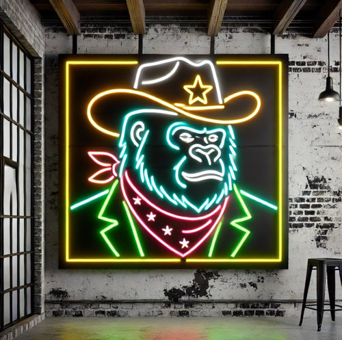 Gorilla in cowboy hat Neon sign, Gorilla sherif neon light, Neon sign with gorilla, Monkey neon light
