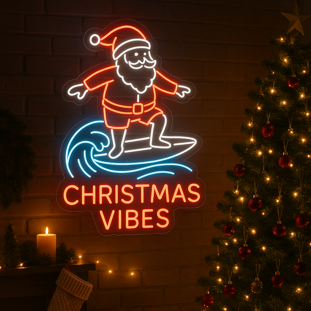 Surfing Santa Christmas Vibes Neon Sign, Beach Santa Neon Sign, Tiki Xmas Neon Sign