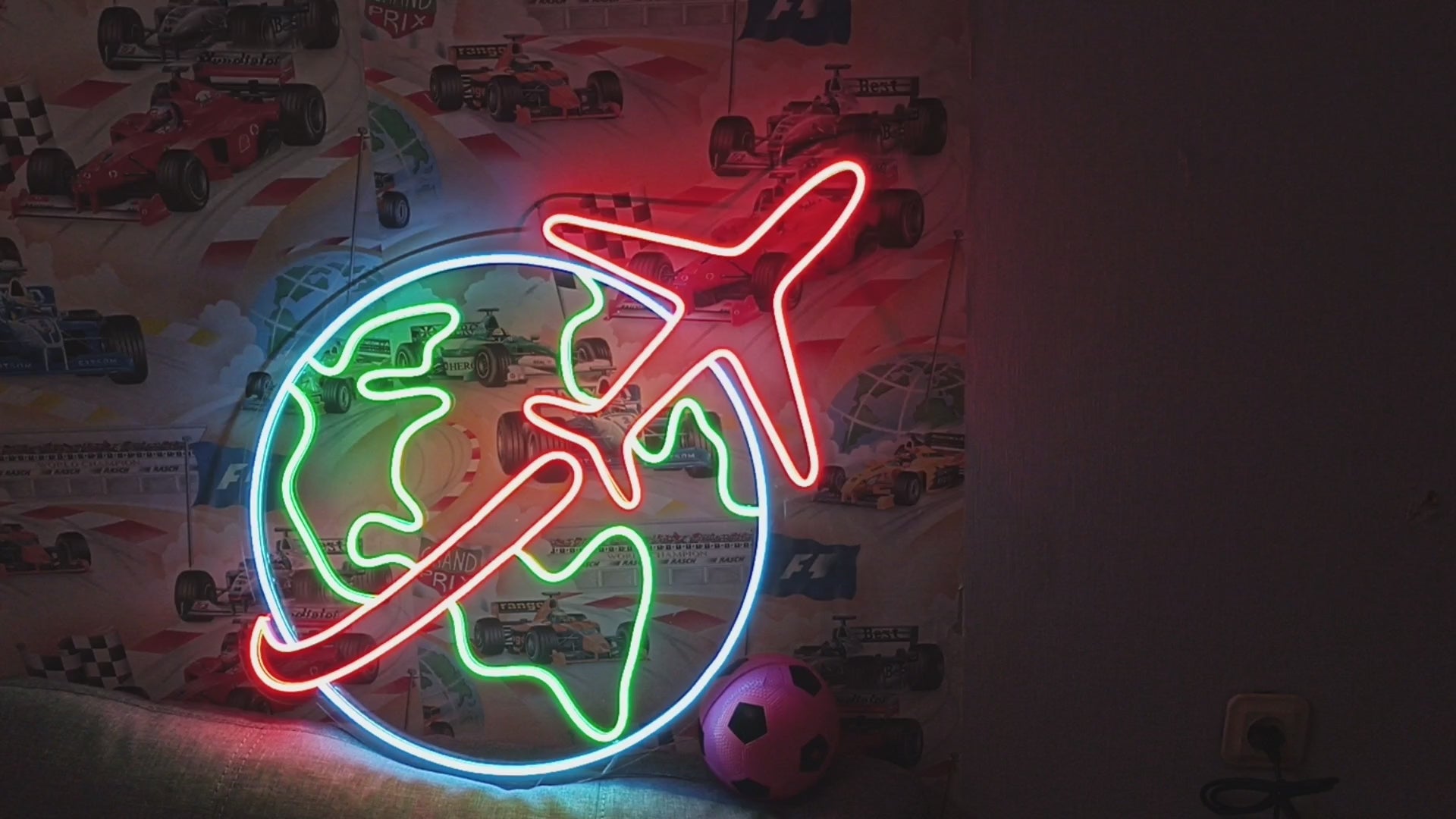 Travel neon sign, planet earth neon sign, airplane neon sign